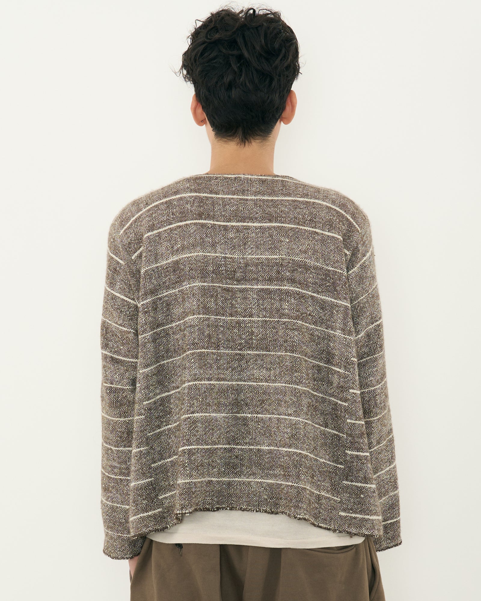 A texture-rich fabric with a light, airy feel interweaving white and brown yak yarns with rhythmic white lines.